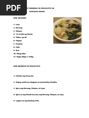 Gawing gabay ang mga salitang hudyat sa pagsusunod-sunod. Mga hakbang sa pagluluto ng tinolang manok - 12777976 shanevelmonte8927 shanevelmonte8927 30032021 Filipino Senior High School answered Mga hakbang sa pagluluto ng tinolang manok 2 See answers alboferachennymarie alboferachennymarie Answer. Ang ating putahe ngayong araw na ito ay ang paborito ng lahat ng Pilipino.